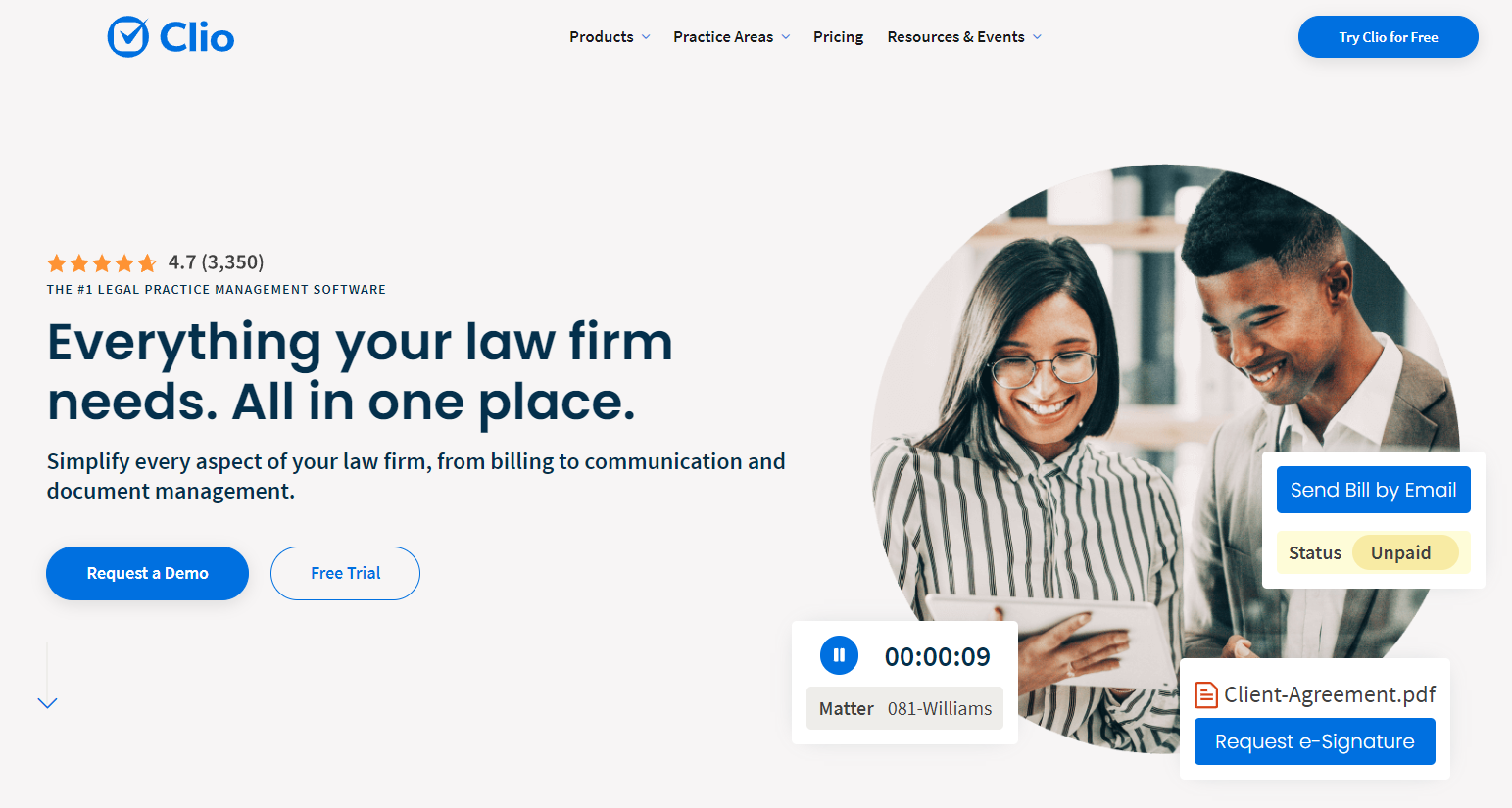 Clio is practice management software for law firms. It offers case management, time tracking, billing, client portals, document automation, integrations with other legal tools and mobile access.